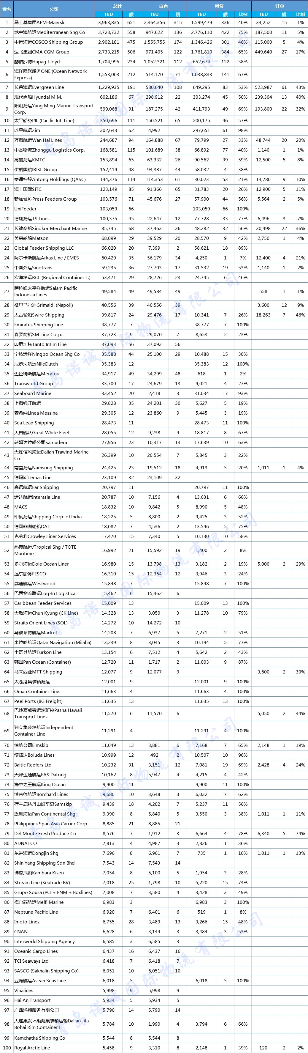 根據Alphaliner最新數據顯示,截至2020年07月03日,全球船公司運力百強名單出來了,前十名依次是: